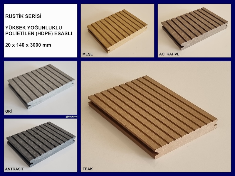 Ahşap Görünümlü Kompozit Deck Kaplamalar iki yüzeyi farklı desene sahip, kaymaz ve antibakteriyel özelliğe sahiptirler.